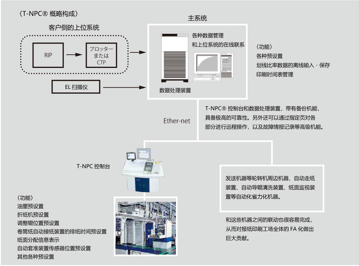 「T-NPC®」可以把印前信息,以及预先输入的信息以印刷模式的方式分别登录,使轮转机各部分能够利用最合适的印刷准备数据预设置,然后根据当日的印刷模式以最佳状态运行。同时,操作者把从日常印刷作业中总结的宝贵经验数据积累在「T-NPC®」中,可以更好发挥轮转机机能,根据具体顾客的需求构建最合适的系统。