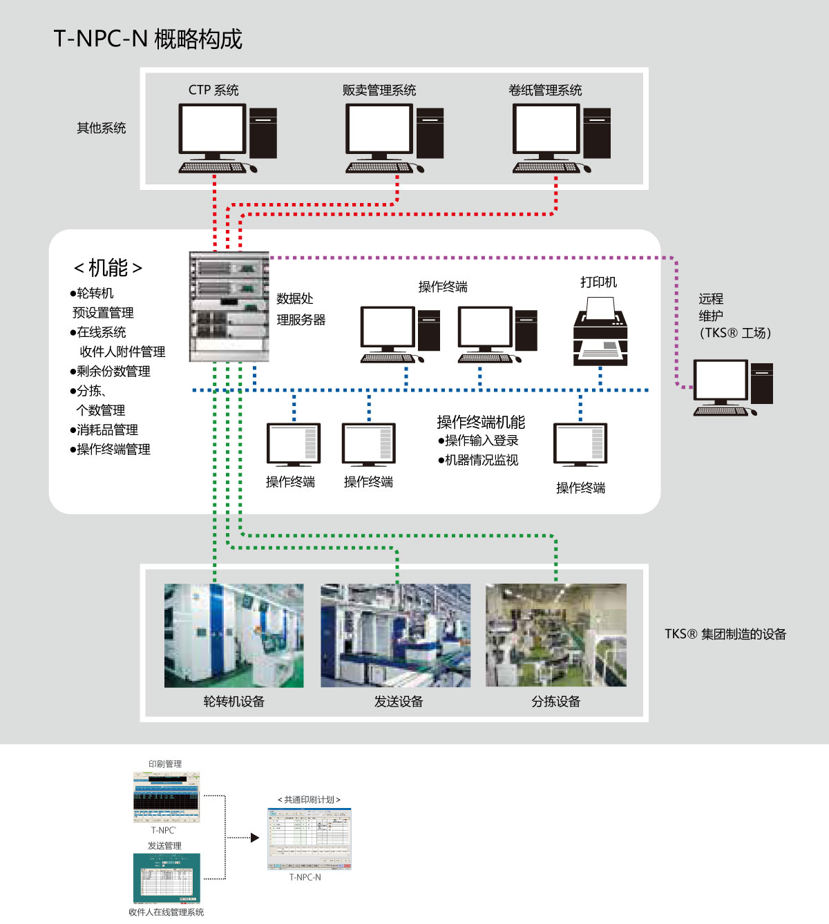 「T-NPC-N」由❶报纸轮转机预设置系统「T-NPC」、❷报纸收件地址信息管理用「收件人在线管理系统」、❸报纸分拣、装载管理用「分拣系统」统合而成的更加高效的报纸制作控制系统。通过把印刷・发送・分拣各系统统合到「T-NPC-N」,可以共享原来由各个系统独立管理的信息。系统可以自动追踪输入数据的变更、运行中各种数据的变化,管理轮转机预设置、发送控制、分拣作业等。