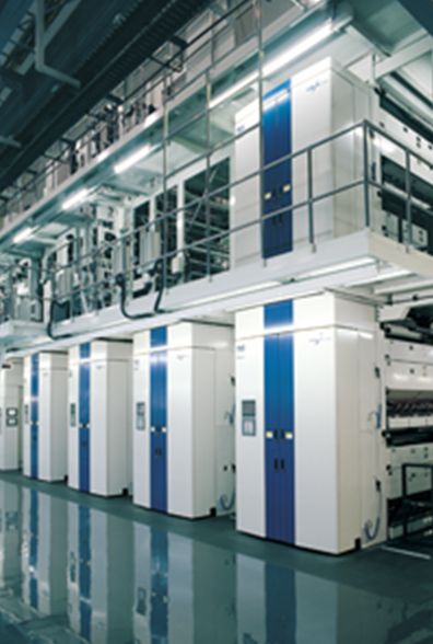 塔式机组的各个BB印刷机组都装备了高性能矢量控制的节能电动机,通过使用高分辨率的脉冲编码和集中控制方式实现对所有电动机的全面同步控制。通过超级驱动系统,从低速运转到高速运转都能达到高精度同步控制,实现了高套准精度和最佳张力控制。