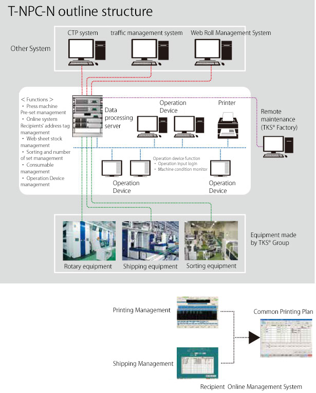 Data input, monitoring the movements of each machine and system, action change operation are arranged in the control room and the operating device (personal computer) of each web press unit. And the status signals and data transceiver communication of web press, shipping equipment and sorting unit are operated through the T-NPC-N network and data server interaction.
